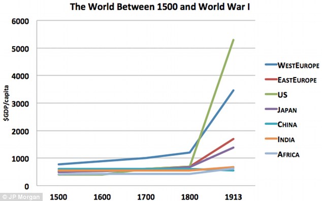 The chart shows that African GDP hardly changed over the centuries; China's rose a little until the year 1500 and then stagnated, as did India's; Japan's rose very gradually; whilst Western Europe's GDP took off from about the year 1100 AD and kept rising.