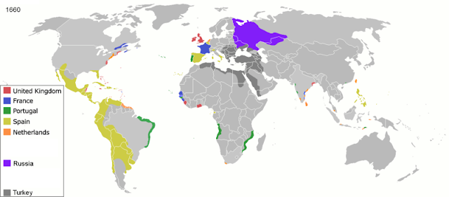 b) There were some Portuguese trading posts established in India by the 1550s, but they are so small they're difficult to see on the map. By the 1660s the European powers were active in the coastal areas, but even so this doesn't really match the fact that Indian economic stagnation began much earlier, by the year 1500.